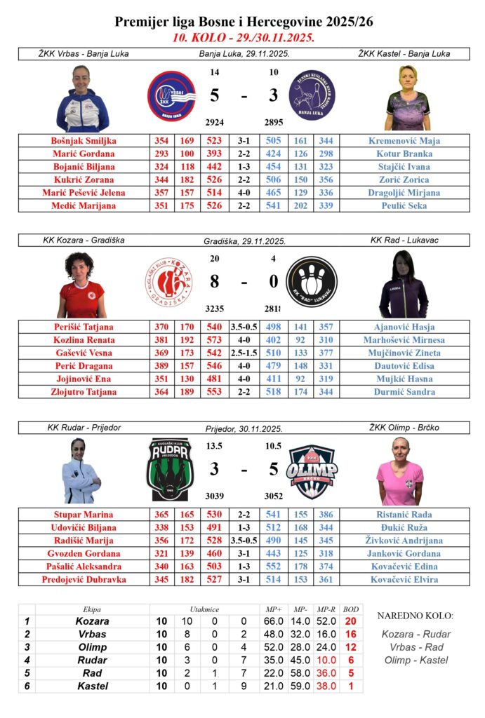 Kuglašice Kozare iz Gradiške koje su preko decenije uzastopni prvaci Bosne i Hercegovine, što u prvenstvenim to u Kup takmičenjima i ove godine nakon deset odigranih kola imaju epitet neporažene ekipe. U prvih deset kola ovogodišnjeg šampionata koji je nikada jači po broju ekipa, ove djevojke su izgubile samo 14 meč poena i na taj način napravili odličnu uvertiru pred kvalifikaciona takmičenja u pojedinačnoj kategoriji koja ih očekuju u entitetskim savezima kao i pred Kup koji je na programu 11. januara 2026. godine u Brčkom.
